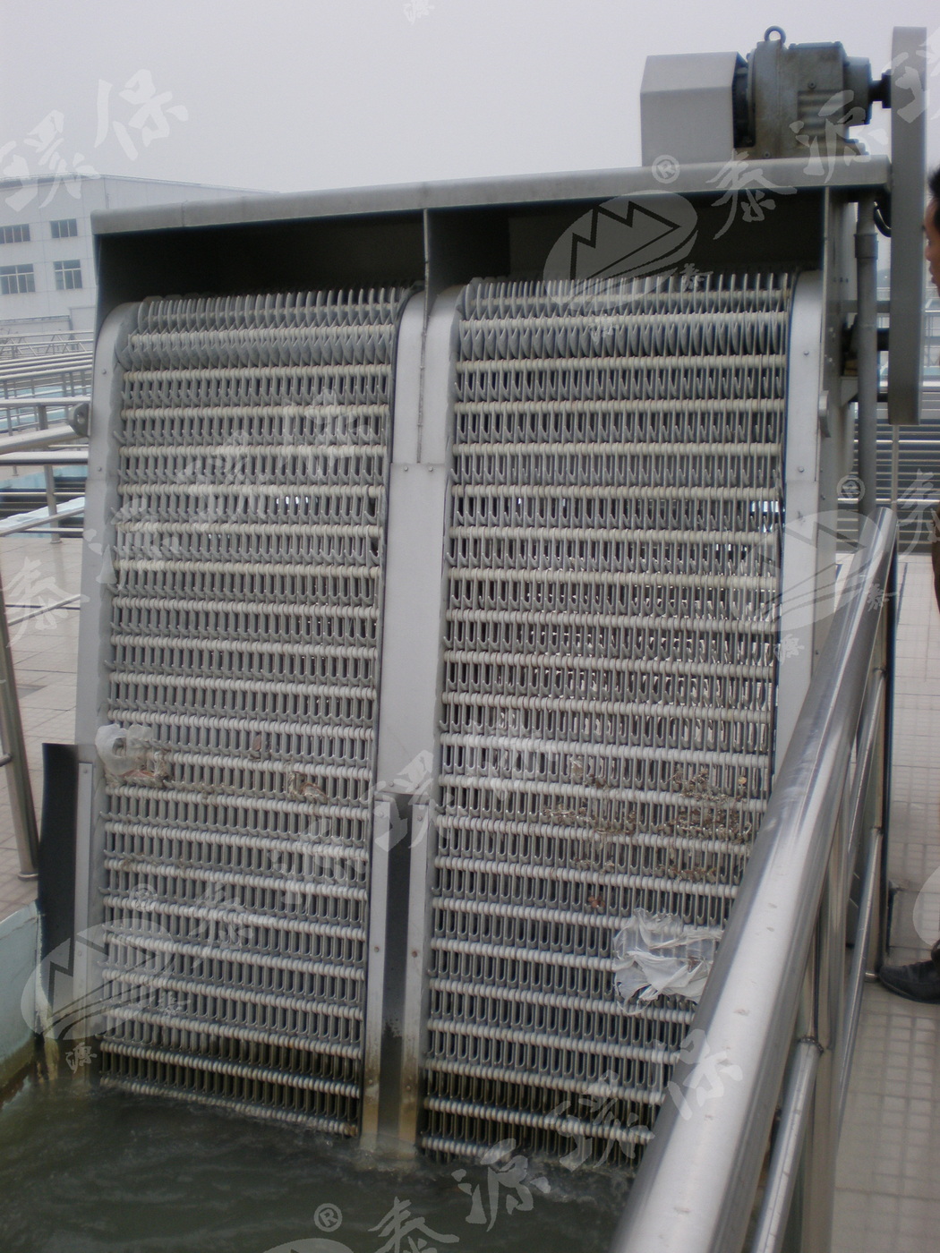 由于耙齿结构设计合理,使耙齿携带杂物到达上端反向运动时,前后相连的两排耙齿之间产生相对自清理运动,促使杂物依靠重力脱落;同时设备后部设置一对与耙齿链运动方向相反的胶板刷,以保证每排耙齿运动到该位置时都能得到彻底的刷净。