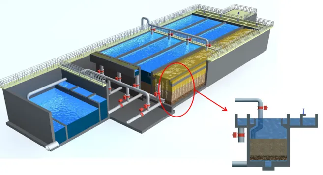 反硝化深床滤池结构简单,安装方便,滤池内无活动部件,滤料无流失,终身无需维护。