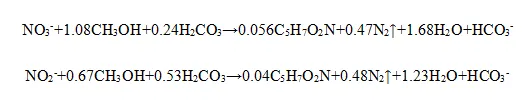 如果污水中碳源有机物不足,应补充投加易于生物降解的碳源有机物,如甲醇、乙酸、乙酸钠等。此时,同时考虑同化异化两个代谢过程的反硝化反应可用下式表示: