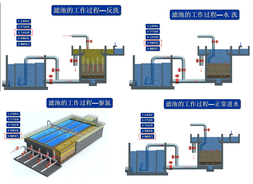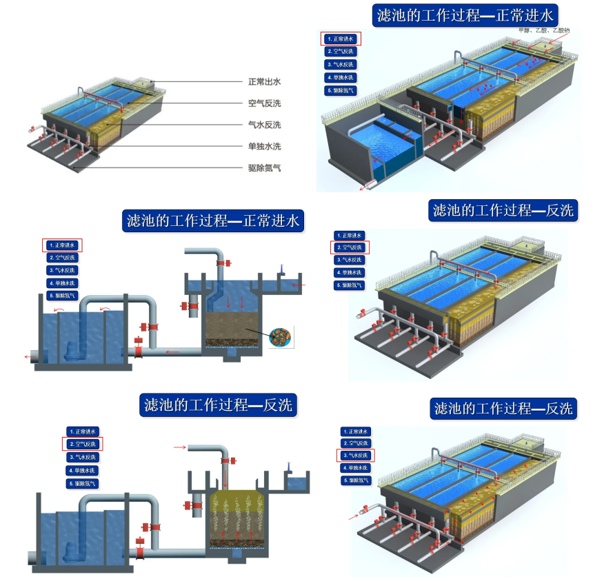 反冲洗流程通常需要三个阶段:①气洗;②气水联合反洗;③水洗或漂洗。