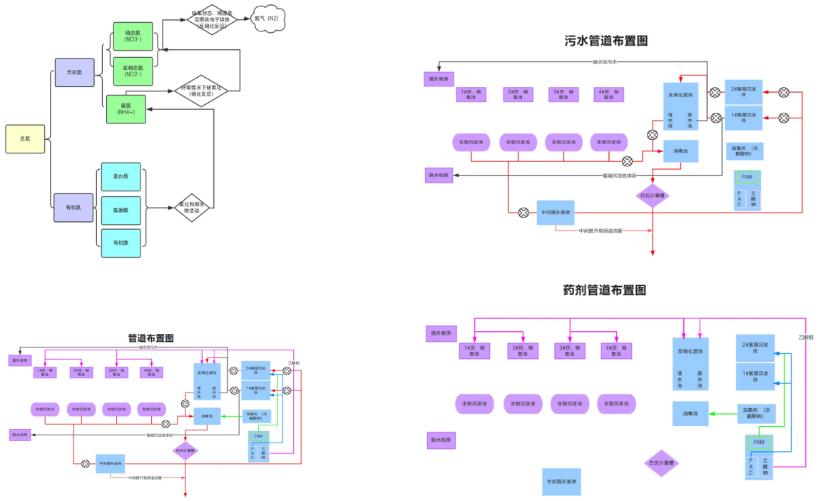 基于上述反硝化机理,反硝化深床滤池在缺氧环境下,通过附着在滤料上的反硝化菌,利用碳源作为电子供体,将硝酸盐或亚硝酸盐还原成氮气(N2)释放,完成反硝化脱氮过程。