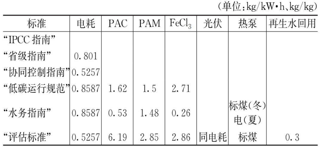 对于排放因子,6项标准对于污水处理直接排放均进行了规定,“IPCC指南”、“省级指南”、“协同控制指南”和“低碳运行规范”相对较为统一。而“水务指南”和“评估指南”对于污水直接排放的排放因子参考国内的文献并结合工艺情况,相对是较为符合我国实际情况的,若能结合实际监测数据,结果更为可靠。间接排放的排放因子主要是“低碳运行规范”、“水务指南”和“评估指南”3个团标中体现。然而,令人意外的是这3项标准中关于排放因子的规定差异也较大,一方面是因为有些标准给出的核算因子是根据活性物质进行计算有些标准是根据物质整体进行换算,另一方面是因为不同的标准参考的不同文献来源。这就需要在计算污水处理厂碳排放时审慎的查询相关因子的来源,分析差异原因,并合理的进行因子取值。