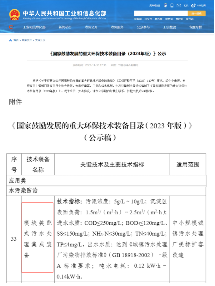 近日,由国家工业和信息化部、生态环境部共同组织编制的《国家鼓励发展的重大环保技术装备目录(2023年版)》正式公告。同时,为更好发挥《目录》引导作用,搭建装备制造企业与需求用户的有效对接渠道,工业和信息化部组织编制了《目录》的供需对接指南,bv1946伟德官网(以下简称bv1946伟德官网环保)入选为装备目录中“模块装配式污水处理集成装备”的主要支撑单位。