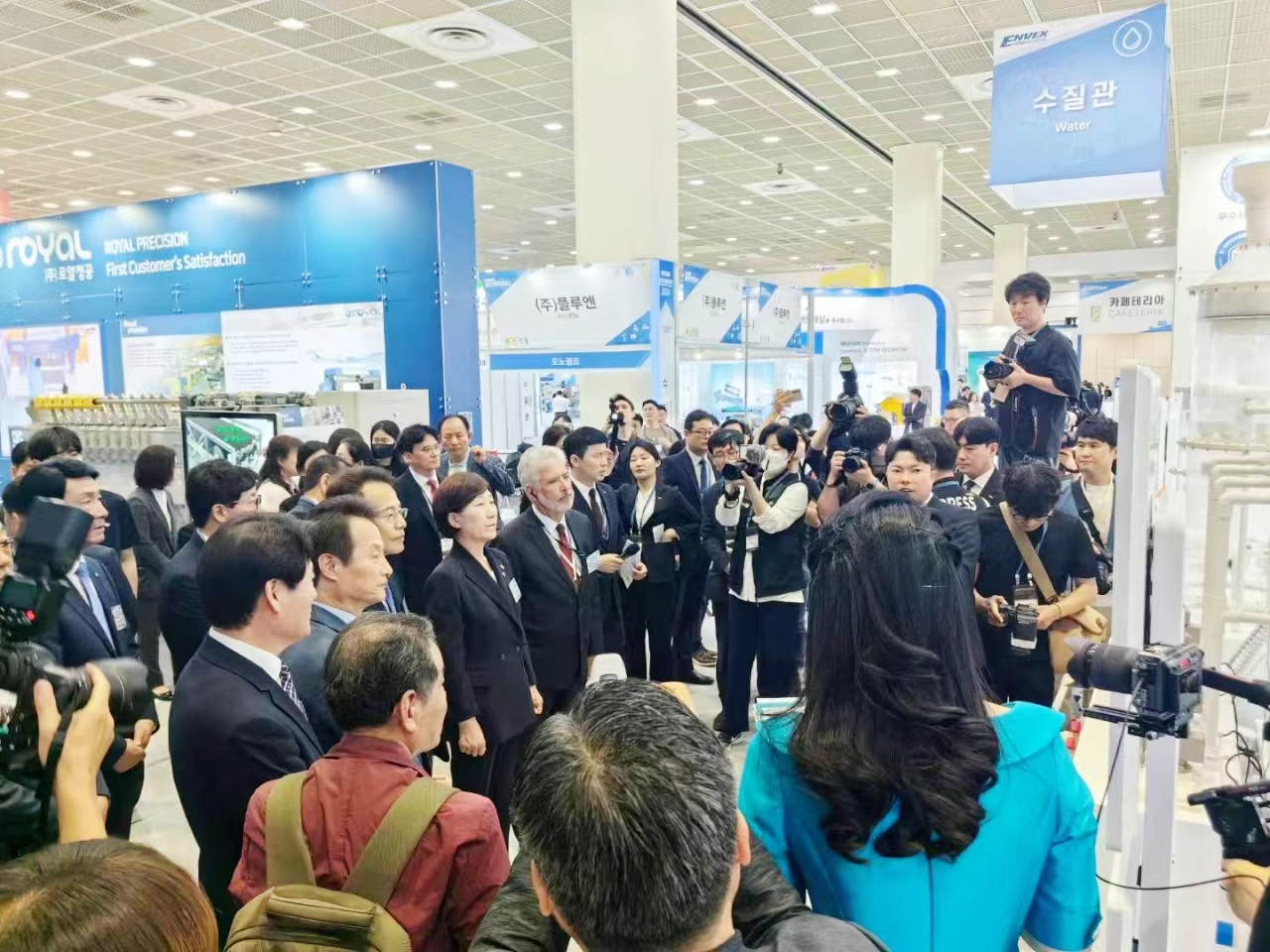 展会现场,公司总经理潘海龙与协会国际贸易促进中心来访考察团成员们参观了此次参展的宜兴市绿色低碳产业会员企业展台,随后与多家韩国知名展商进行深入交流,对韩国在环境监测、污染控制和资源循环利用等领域最新技术和市场动态进行了解,这也为我司企业经营思路拓展提供宝贵经验。