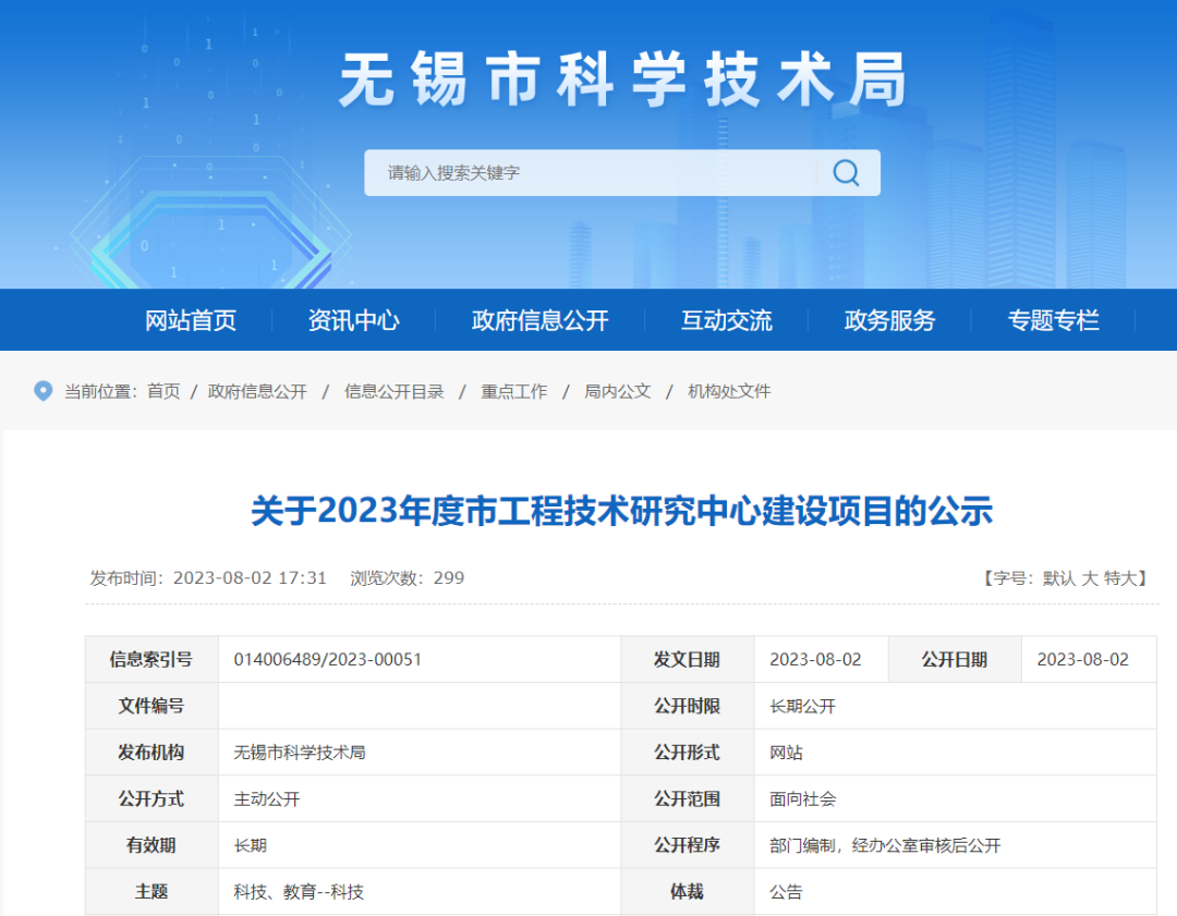 近日,无锡市科学技术局公示了《关于2023年度市工程技术研究中心建设项目名单》。经企业申报、资格审查、专家评审和公示认定等程序,bv1946伟德官网(以下简称bv1946伟德官网环保)成功获批无锡市工程技术研究中心——无锡市水环境工程装备化工程技术研究中心。