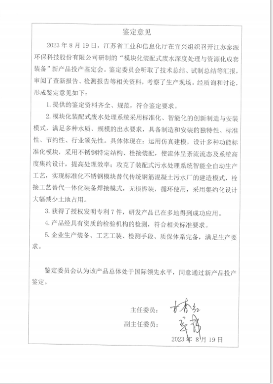 在听取技术总结、试制总结等汇报,审阅查新报告、检测报告等相关资料,考察生产现场后,经过充分讨论、质询,鉴定委员会专家形成相关意见,一致认为:bv1946伟德官网环保研制的“模块化装配式废水深度处理与资源化成套装备”新产品总体处于国际领先水平,同意通过新产品投产鉴定。