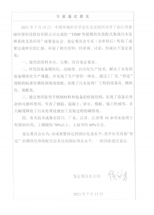 在2021年7月,中国环境科学学会、中国工程院院士侯立安担任鉴定委员会主任,中科院、北京林业大学、北京科技大学等七所高校或科研院所的教授或研究员任委员组成的鉴定专家委员会即对公司“TIMP智能模块化装配式集成污水处理系统及其应用”进行科技成果鉴定。